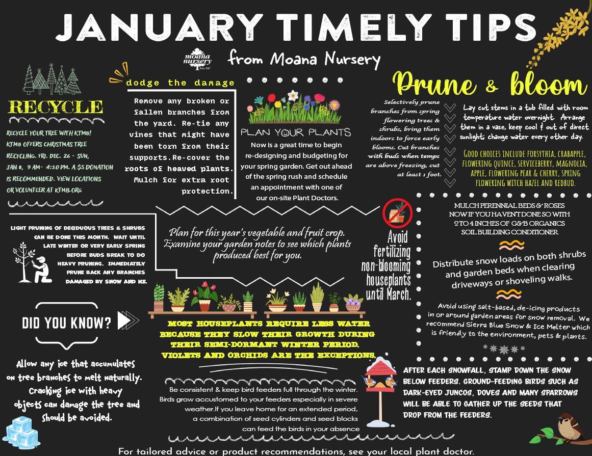 - Now is a great time to begin re-designing and budgeting for garden improvements. Get out ahead of the spring rush and schedule an appointment with one of Moana’s on-site Plant Doctors.